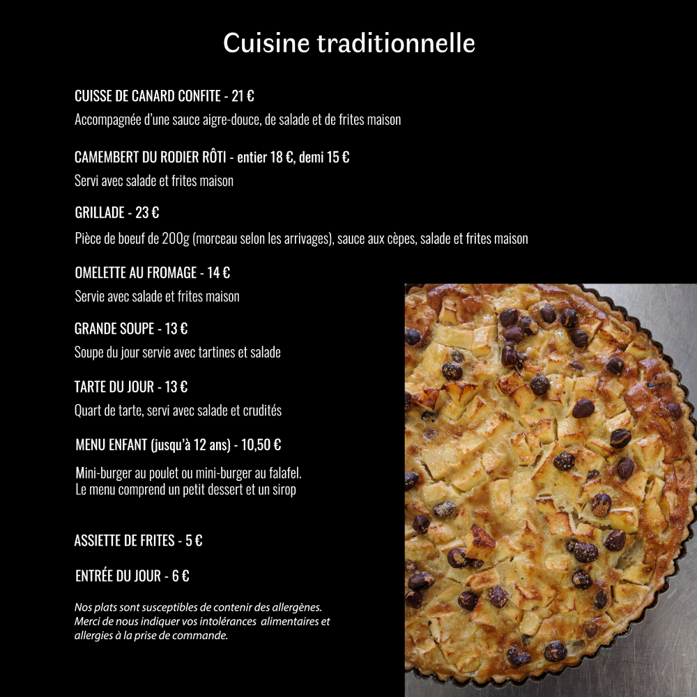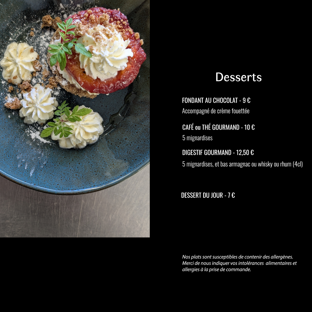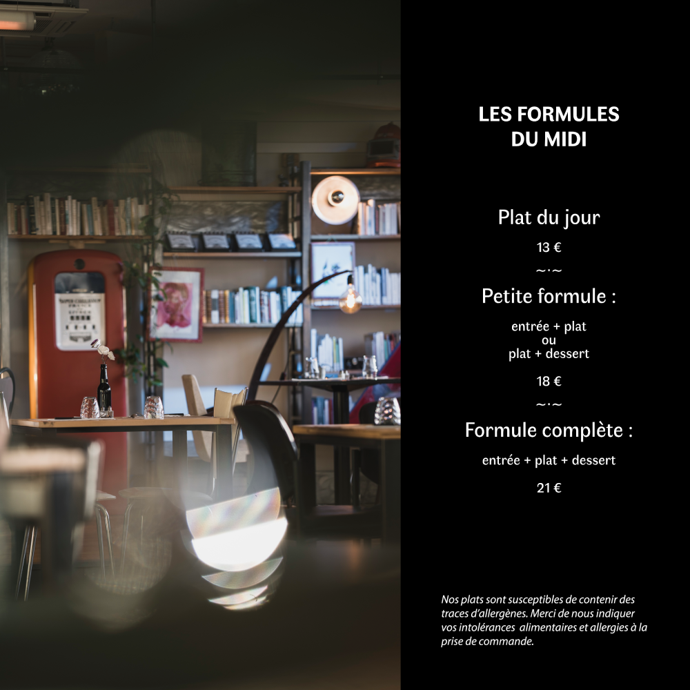 Nos plats sont susceptibles de contenir des allergènes : gluten, fruits à coques, crustacés, poisson, soja, lactose, arachides, céleri, œuf, moutarde, sésame...